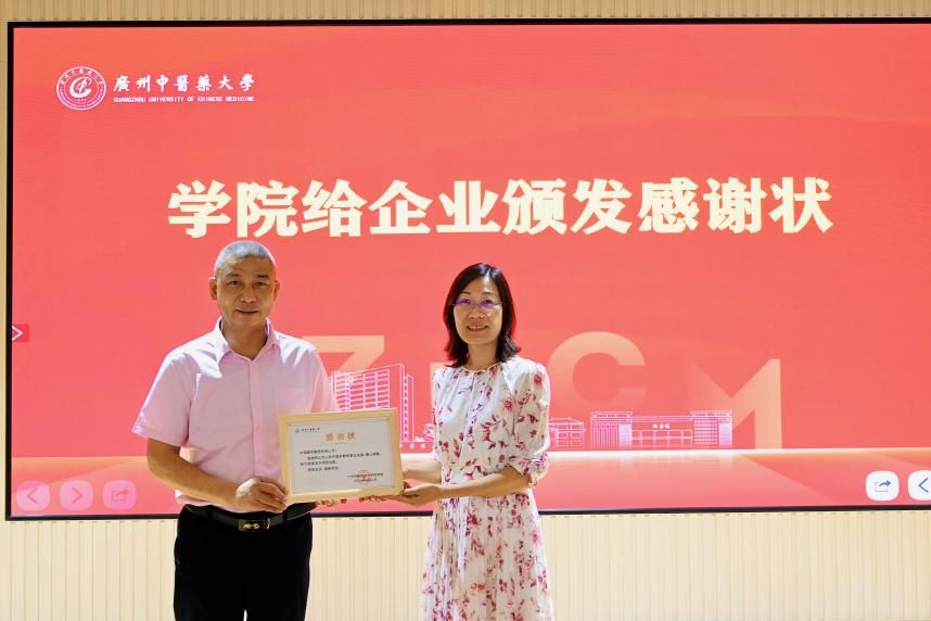 张娟书记为大翔医药集团有限公司陈东平董事长颁发感谢状,在陈东平董事长的带领下,大翔医药集团有限公司一直积极关注中医药教育事业的发展,暖心捐赠,帮助了众多学生渡过难关。
