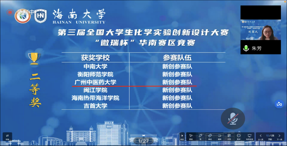 7月26日,第三届全国大学生化学实验创新设计大赛华南赛区决赛在海南大学闭幕。PP电子游戏网站尹利娜、胡庆忠老师指导本科学生(成员:郑培森、张琳童、周悦)参赛的“新型多组分反应构建类天然产物的优势骨架用于创新药物发现”实验项目荣获华南赛区二等奖!本次大赛共有61所高校参加,包括中山大学、厦门大学、中南大学、华南理工大学、湖南大学等诸多双一流高校。大赛历时三个多月,学院团队经过两轮激烈的淘汰赛,最终荣获二等奖的好成绩。