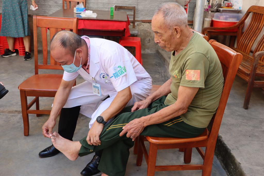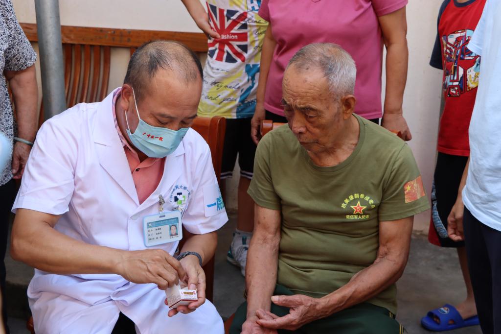 7月25日,PP电子游戏网站师生与一附院专家团队一道,顶着烈日高温,历经3小时车程,来到罗定市泗纶镇,上门为抗美援朝老英雄沈金水送医送药。