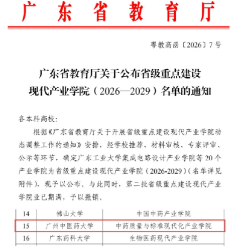 近日,广东省教育厅正式公布2026—2029年省级重点建设现代产业学院名单,PP电子官网依托PP电子游戏网站建设的中药质量与标准现代化产业学院成功入选。本次全省共有20个产业学院获批,这是PP电子官网首次获得省级重点建设现代产业学院立项,实现了在该领域零的突破。