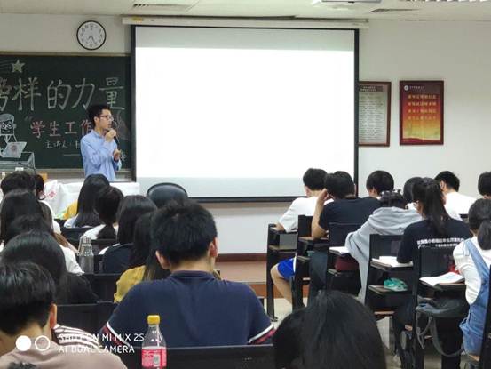 韦利泽同学曾担任班级团支部书记、学院团委副书记。他首先给同学们讲了一个故事:习近平总书记在天津与村官杨代显交谈时指出,在做实际工作时,情商很重要。韦利泽以这个故事,引出学生干部工作关键词:情商。随后,从共情、用情、心晴三个部分分享他的体会。他说,共情意味着要尊重对方的付出,体会他人的心情。用情,就是要以真情相待,掌握与他人的相处方式。心晴就是要心情晴朗,凡事尽力而为,心态平常,才能保持良好心情。他还结合一些个人经历加以解释说明。最后,他与同学们就如何在社团与学习之间如何选择,是否留任等问题作了交流。