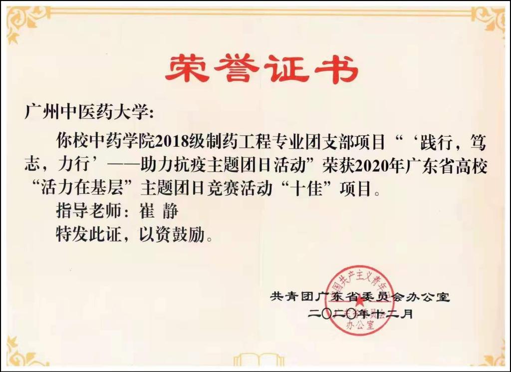 在庆祝中国共青团成立100周年之际,团省委公布了广东省“五四红旗团委(标兵)、五四红旗团支部(标兵)、优秀共青团干部、优秀共青团员”的名单,PP电子游戏网站18级制药工程团支部荣获“广东省五四红旗团支部”称号。