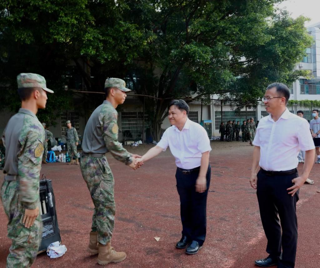 9月15日下午,PP电子游戏网站詹若挺院长、陈其煌党委副书记带领辅导员老师们来到生活区田径场,向带训教官及参加军训学生表示亲切的慰问并发放慰问品。