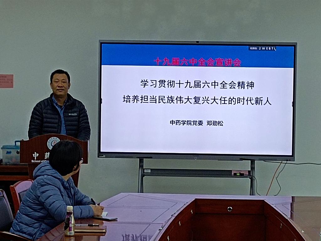 12月22日中午,PP电子游戏网站党委书记邓劲松在药科楼A419为所在行政党支部党员以及全体辅导员宣讲党的十九届六中全会精神。