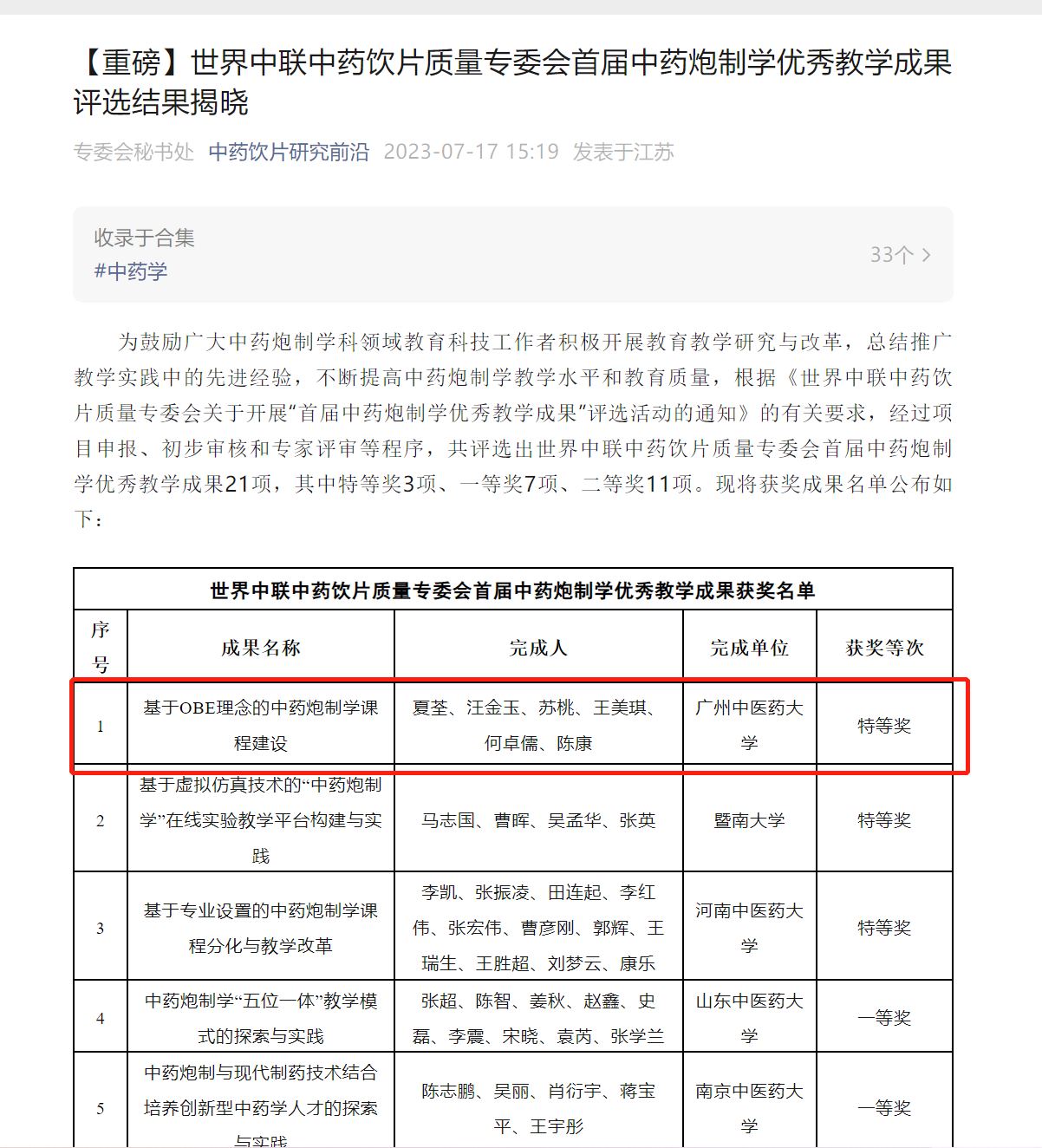 日前,我院中药炮制学教学团队,在世界中医药学会联合会中药饮片质量专委会组织的“首届中药炮制学优秀教学成果”评选活动中,喜获特等奖。此次评选活动共评出优秀教学成果21项,其中特等奖3项、一等奖7项、二等奖11项。