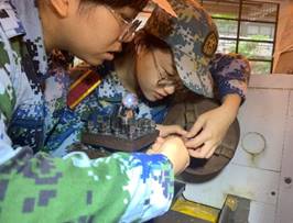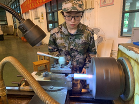 《金工实训》是一门实践性的技术基础课,实训工种分别是焊接、车工、数车、先进制造、焊接、钳工、铣磨、数铣、装配、铸造、压力加工、热处理和先进制造。“凡学百艺,莫不有师”,每个工种由广东工业大学的老师分别负责,教学团队包括万宏治、郑伟民、姚辉、黎双利、赖建平、兰通亮、彭志敏、范素芬、苏志军和陈健东等老师。教师们首先向学员们讲述实习项目的工作原理和内容,随后由学员们进行实操。教学经验丰富的教师们采取“手把手”“师傅带徒弟”的方式,耐心地指导学员们操作。“纸上得来终觉浅”,在教师们的耐心指导与悉心关怀下,在强调“安全第一”的前提下,由学员们独立操作并完成每项实训任务。学员们都将平时积累的理论知识应用到实践中来,将一块没有生命力的铁打成一块蕴含着创造智慧和合作精神的艺术品,为自己的辛劳报以完美的答卷。当学员们手捧自己创作的艺术品时,心灵静谧散发出内心潜藏的智慧,让 学员们真切地感受“这不仅是铸铁,更是锻心”。