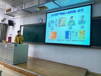 马俊英博士,是博士生导师,国家优秀青年科学基金项目获得者,“中国药学会海洋药物专业委员会”青年委员,“广东省特支计划”百千万工程青年拔尖人才,“广州市珠江科技新星”,“中科院青年创新促进会”会员。马教授结合《中药化学》课程内容,对其中生物碱、木脂素、肽类、海洋中药、生物转化等内容结合抗生素的发展状况进行拓展:从《神农本草经》《千金方》《本草纲目》到青霉素、链霉素、阿维霉素等小分子药物;从疟疾、白色瘟疫、肿瘤到超级细菌等疾病的认识,中药及天然药物中的活性成分在其治疗药物的发现发展中占有重要地位。同时马教授结合抗生素发展史、海洋药物研发具体实例及自身科研——“深海放线菌源抗结核环肽的发现、生物合成及其作用机制”,言传身教,分享科研的乐趣、科研思维及研发历程,专业与思政教育相结合。课程内容信息量大,学生在讲座结束后踊跃提问,不仅咨询到实验用海洋微生物的来源及培养环境限制等专业问题,同时还对国内外海洋药物研究的科研环境进行了解。极大促进了本科生对《中药化学》在中药学甚至天然药物领域中的重要地位的认识,同时也拓展了本科生的科研思维和科研视野。