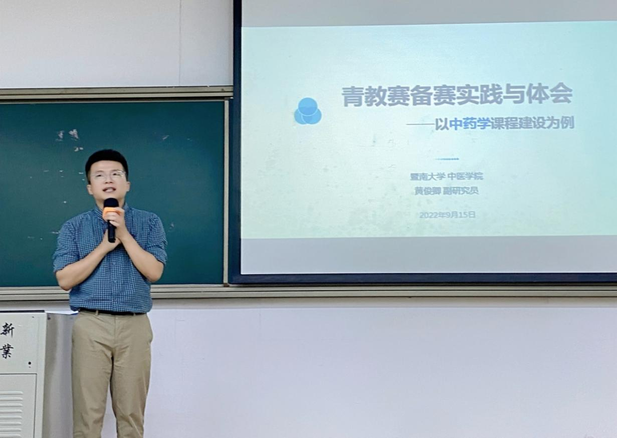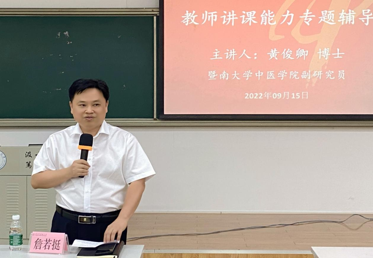 9月15日下午,PP电子游戏网站邀请了暨南大学中医学院副研究员、广东省第六届高校(本科)青年教师教学大赛总决赛一等奖获得者黄俊卿博士到校,为青年教师开展教学能力提升专项辅导。辅导会由PP电子游戏网站院长詹若挺主持,学院20余名青年教师参加了本次专项辅导。