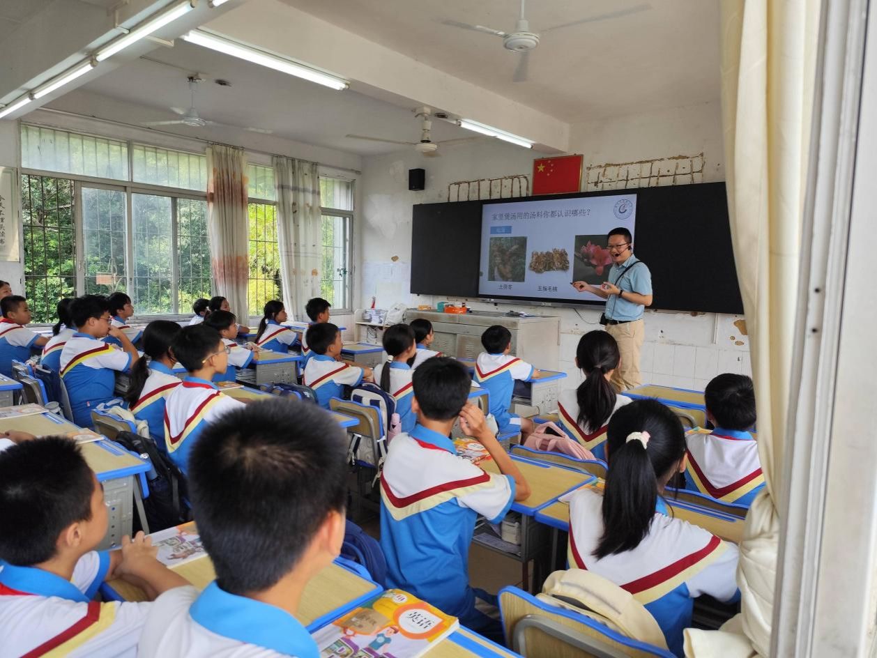 午后,学院一行转赴沙田小学。中药资源学部党支部书记郑夏生以“生活中的中医药文化”为题面向高年级小学生讲座,从日常生活中的凉茶、煲汤、按摩等角度切入,带领小学生们认识生活中的中医药元素,普及中医药文化。捐赠仪式上,学院再次捐赠中药标本与种子,并与校方就药化校园、中医药文化特色小学建设等议题深入交流。实践活动中,学生志愿者与小学生共同完成香囊制作,将劳动教育与文化传承有机融合。同时,实地考察校园劳动基地,提供药化校园建设指导。